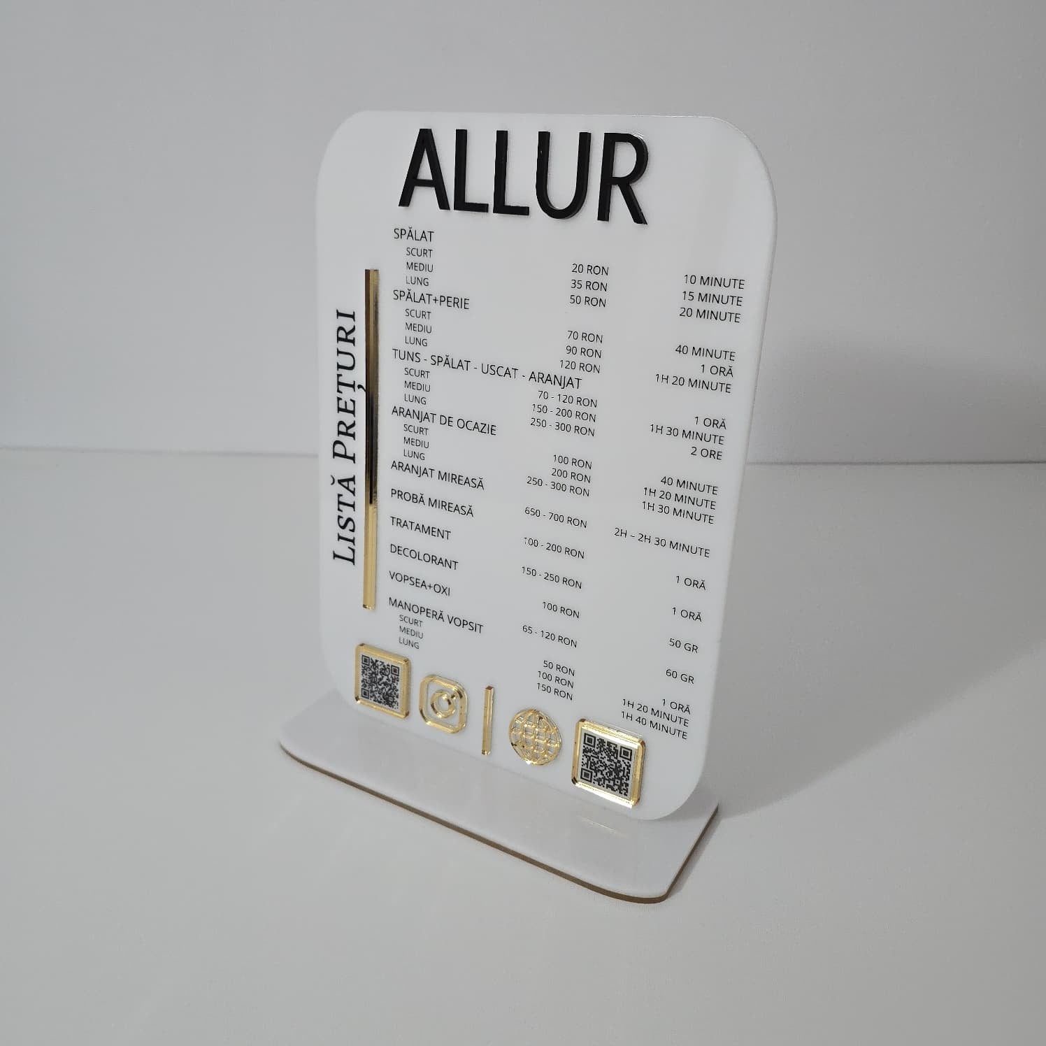 Placheta noastră elegantă în format A4 este soluția ideală pentru a expune lista de prețuri într-un mod profesional și modern.Realizată din acril alb lucios cu suport la fel de strălucitor, placheta oferă un aspect minimalist și premium. Textul este gravat cu precizie în negru, asigurând claritate și durabilitate.